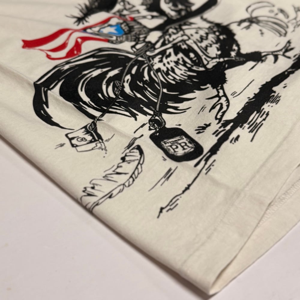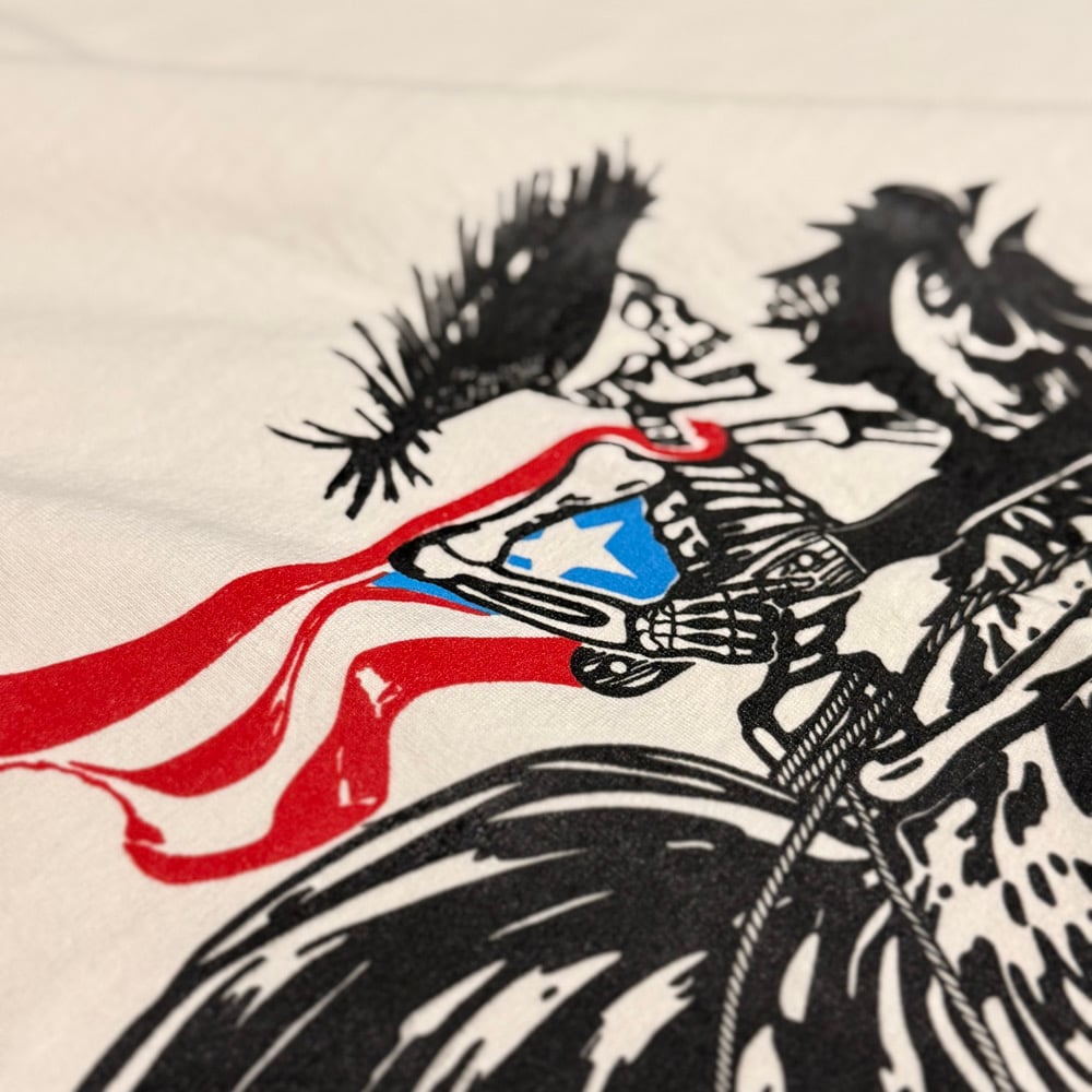 “Resistencia” es una obra que galopa con fuerza hacia adelante, un gallo desbocado cargando en su lomo a un esqueleto que simboliza la lucha eterna. El jinete lleva la bandera de Puerto Rico al cuello como emblema de identidad, un machete en la mano y una pava en la cabeza como grito de dignidad y lucha. Entre el frenesí aparecen plátanos y pitorro, raíces de pueblo, mientras un squeegee de serigrafía afirma la mano obrera y el arte como armas de resistencia. Es movimiento, es furia, es memoria viva que no retrocede.